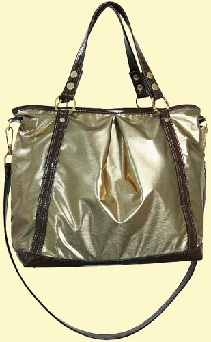 Made with Mia Bossi's signature dotted print waxed canvas or a metallic gold fabric, trimmed with faux patent brown leather and finished with polished gold hardware.